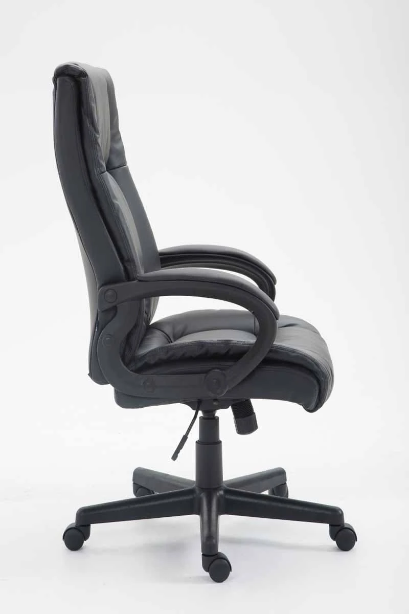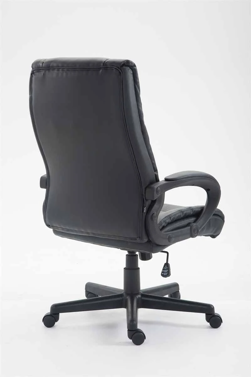 Der Chefsessel XL Sparta überzeugt mit einer sehr hochwertigen Polsterung und einem Kunstlederbezug im Sitz- und Rückenbereich, sowie auf den Armlehnen. Kunstlederbezüge haben den Vorteil, dass sie elastisch sind und sich bei Entlastung wieder glatt ziehen. Dies sieht nicht nur schöner aus, sondern erhöht zusätzlich die Lebensdauer des Sitzbezuges. Auch in Sachen Komfort lässt der Bürostuhl keine Wünsche offen, denn mit der ergonomisch geformten Rückenlehne und der stufenlos verstellbaren Sitzhöhe, die mithilfe des Hebels unter dem Sitz bedient wird, ist eine angenehme Sitzposition garantiert. Bewegungsfreiheit wird durch den eingebauten Wippmechanismus ermöglicht. Das Gestell ist aus Kunststoff und steht standsicher auf fünf Leichtlaufrollen durch die man immer leicht und locker über den Boden rollen kann – egal ob Hart- oder Teppichböden.