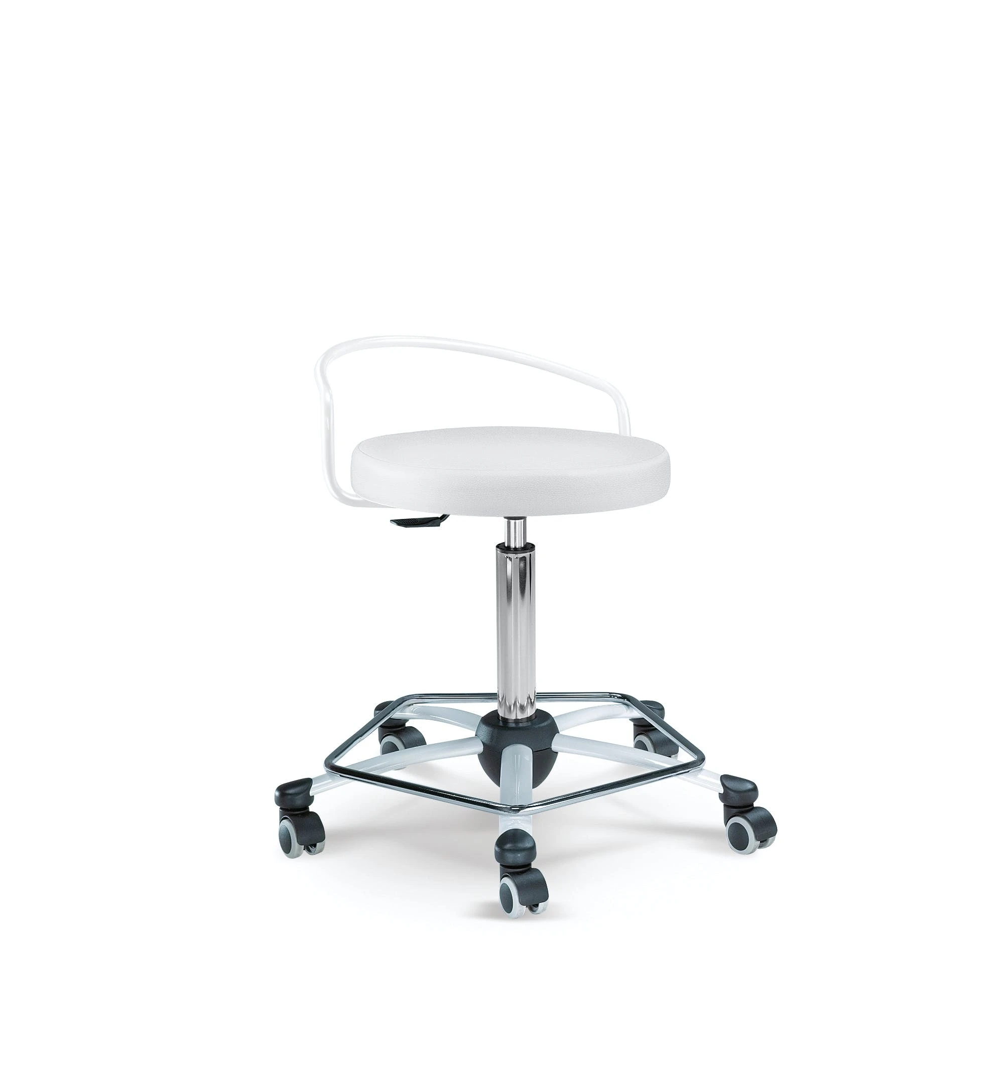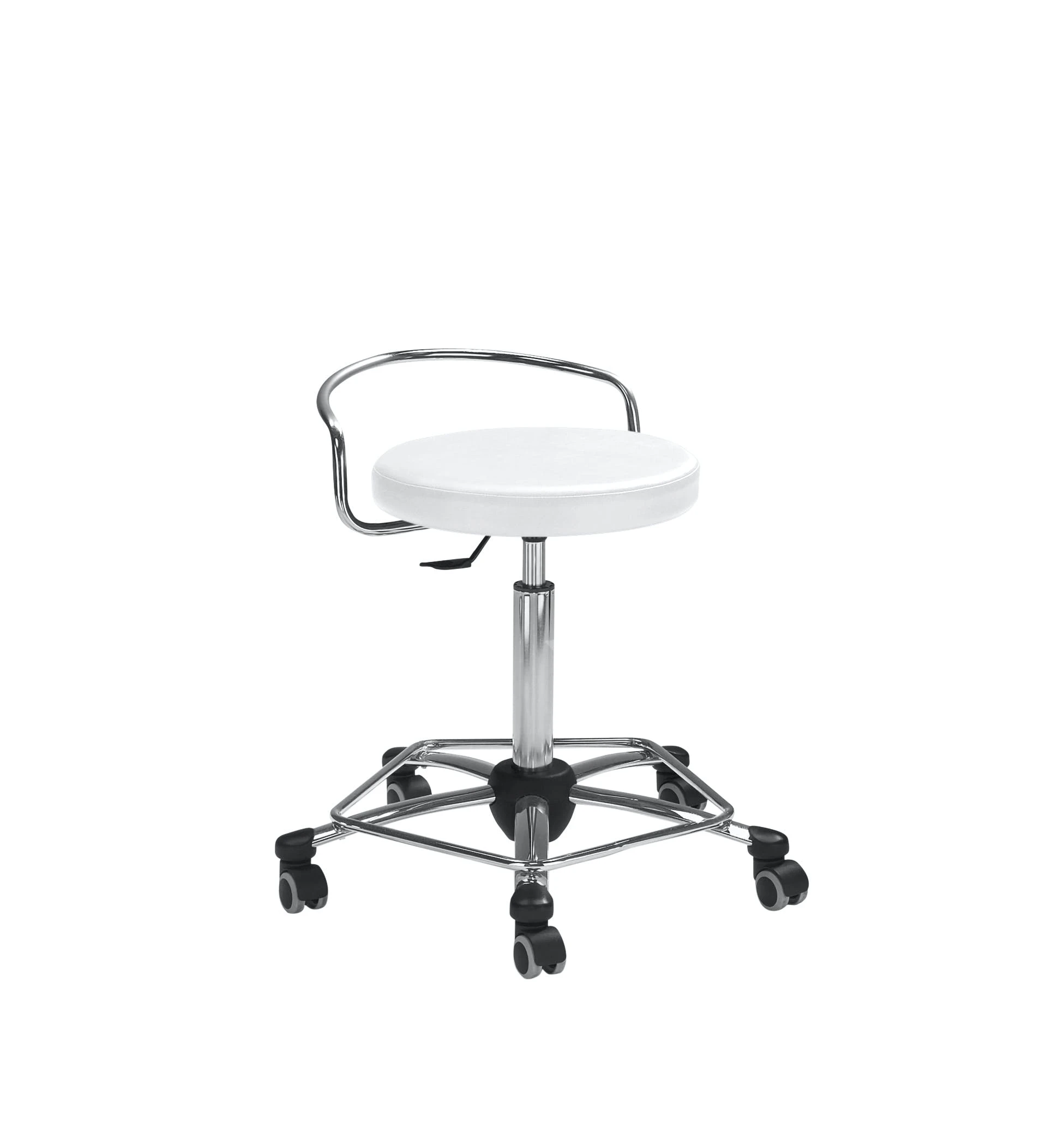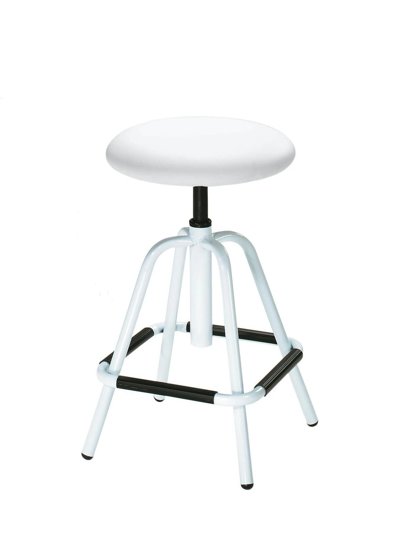 Gestell weiß, Sitz gepolstert, stufenlose Höhenverstellung durch Gasfeder, inkl. Rollen für Hartböden, Sitzhöhe 54 – 74 cm.