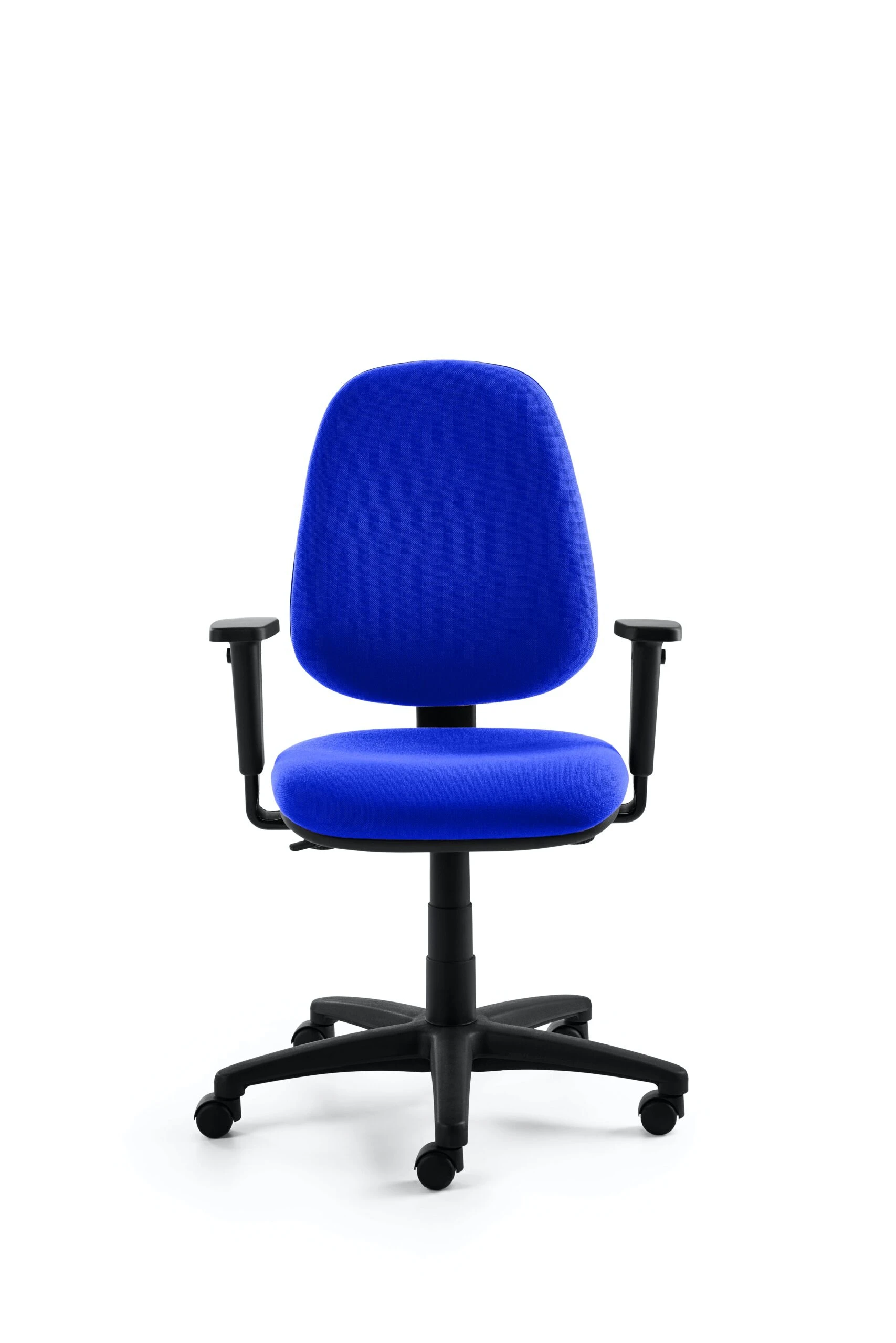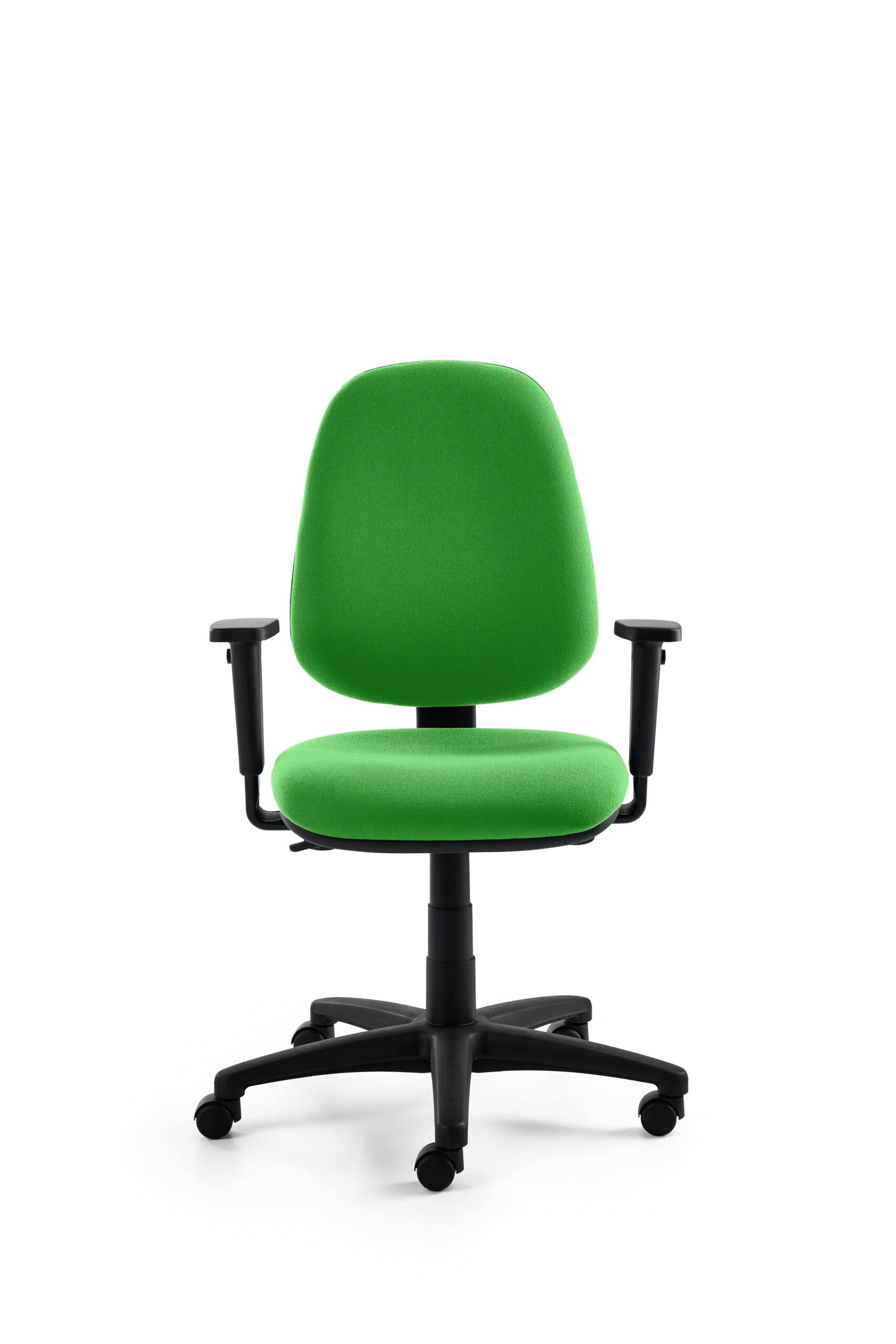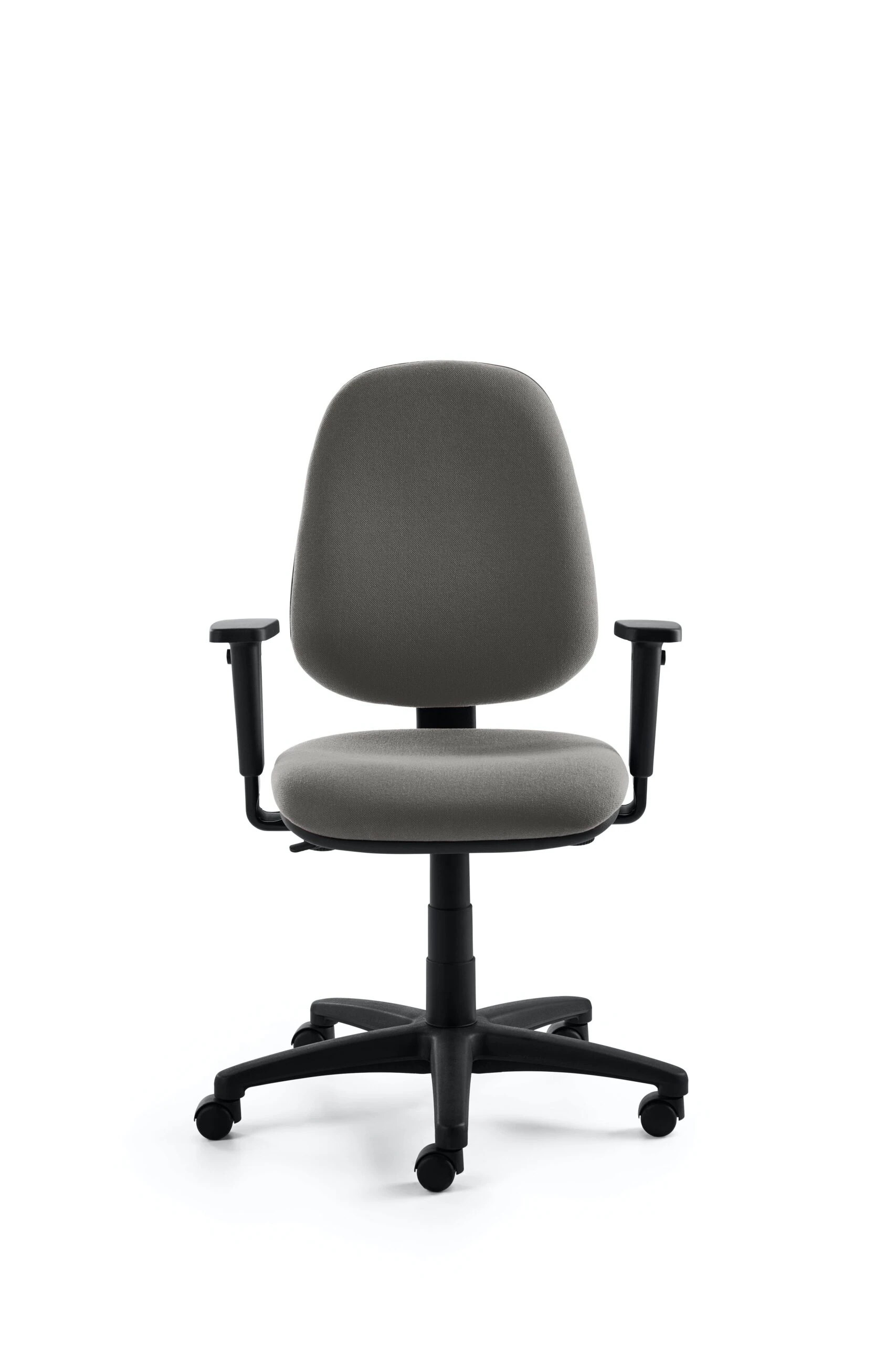 Mittlerer Rücken, Standard-Mechanik, Rücken in Tiefe und Höhe verstellbar, stufenlose Höhenverstellung durch Gasfeder, 360° drehbar, Kunststoff-Fußkreuz und Gestell lichtgrau, inkl. Rollen für Teppichboden, Sitzhöhe 42 – 53 cm. Armlehnen feststehend lichtgrau.