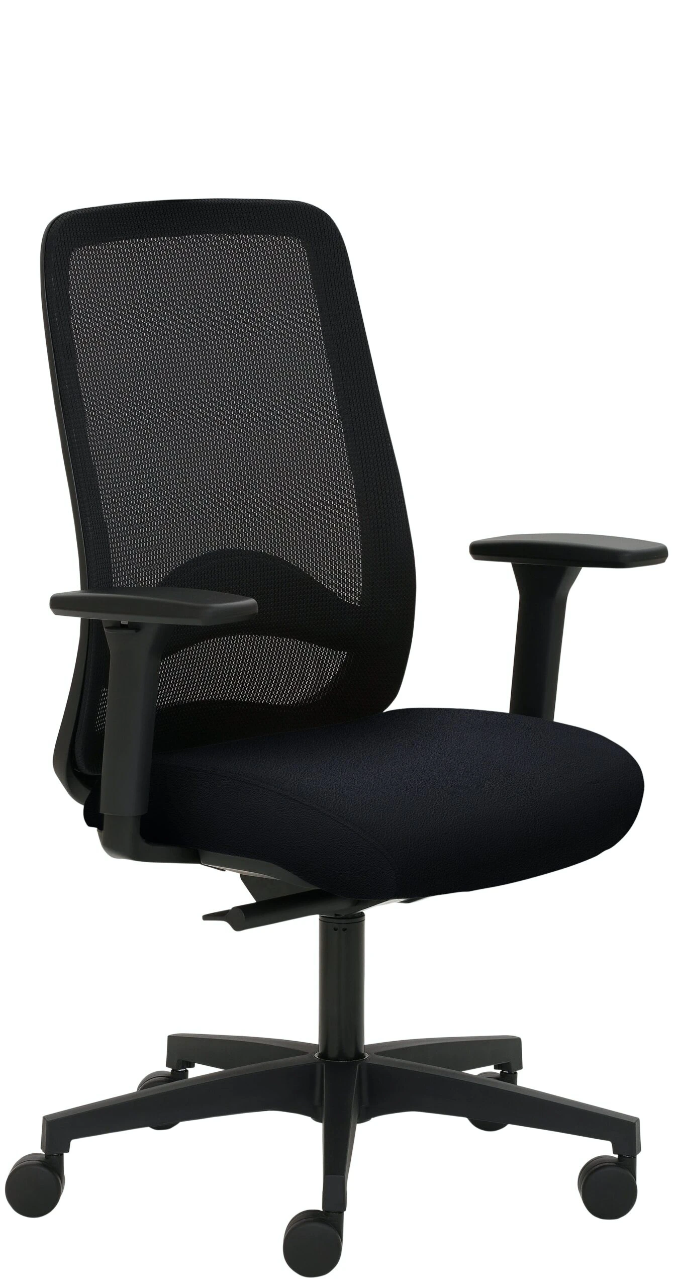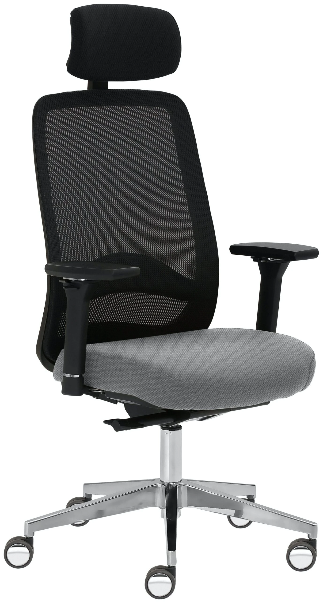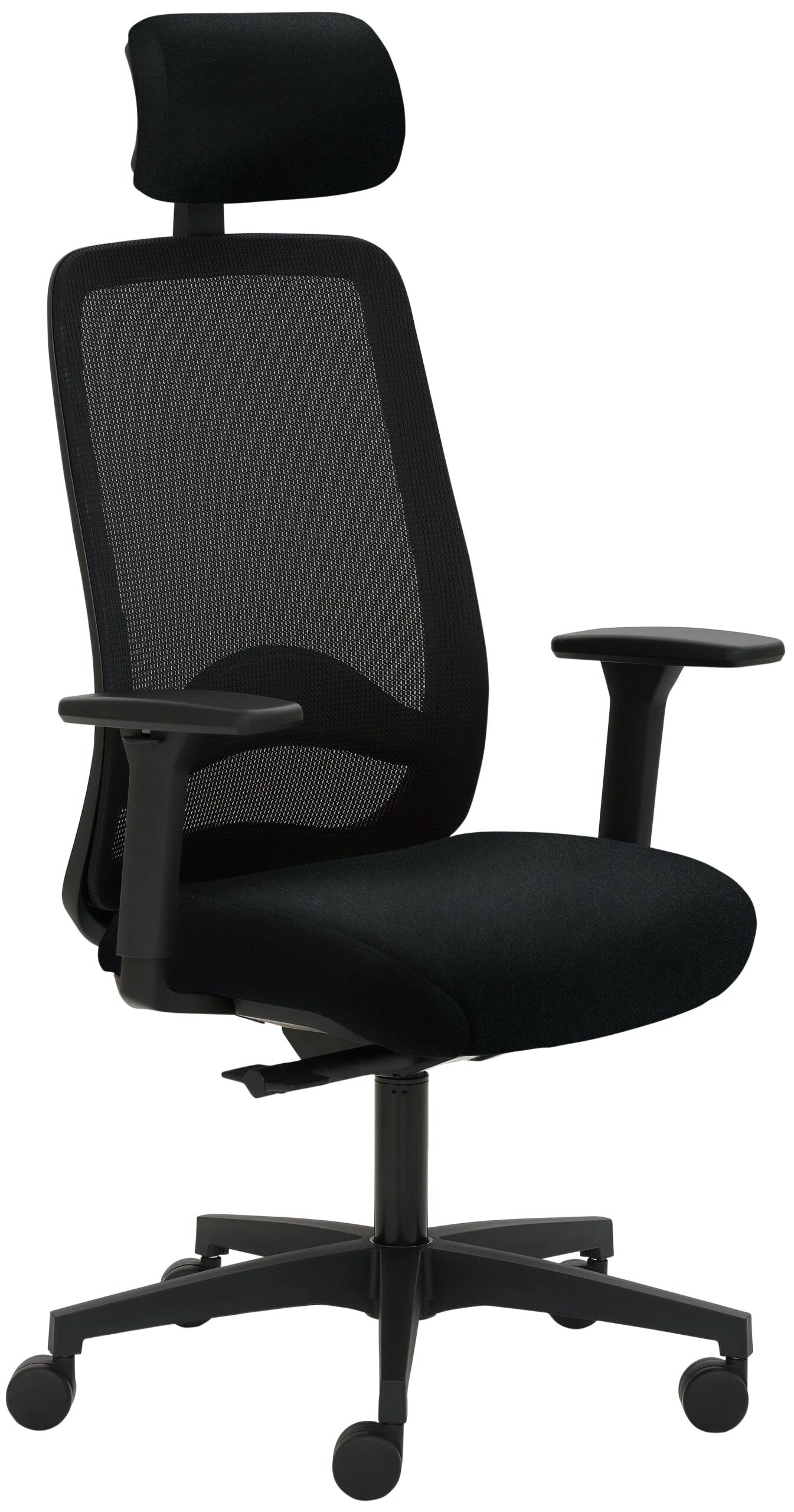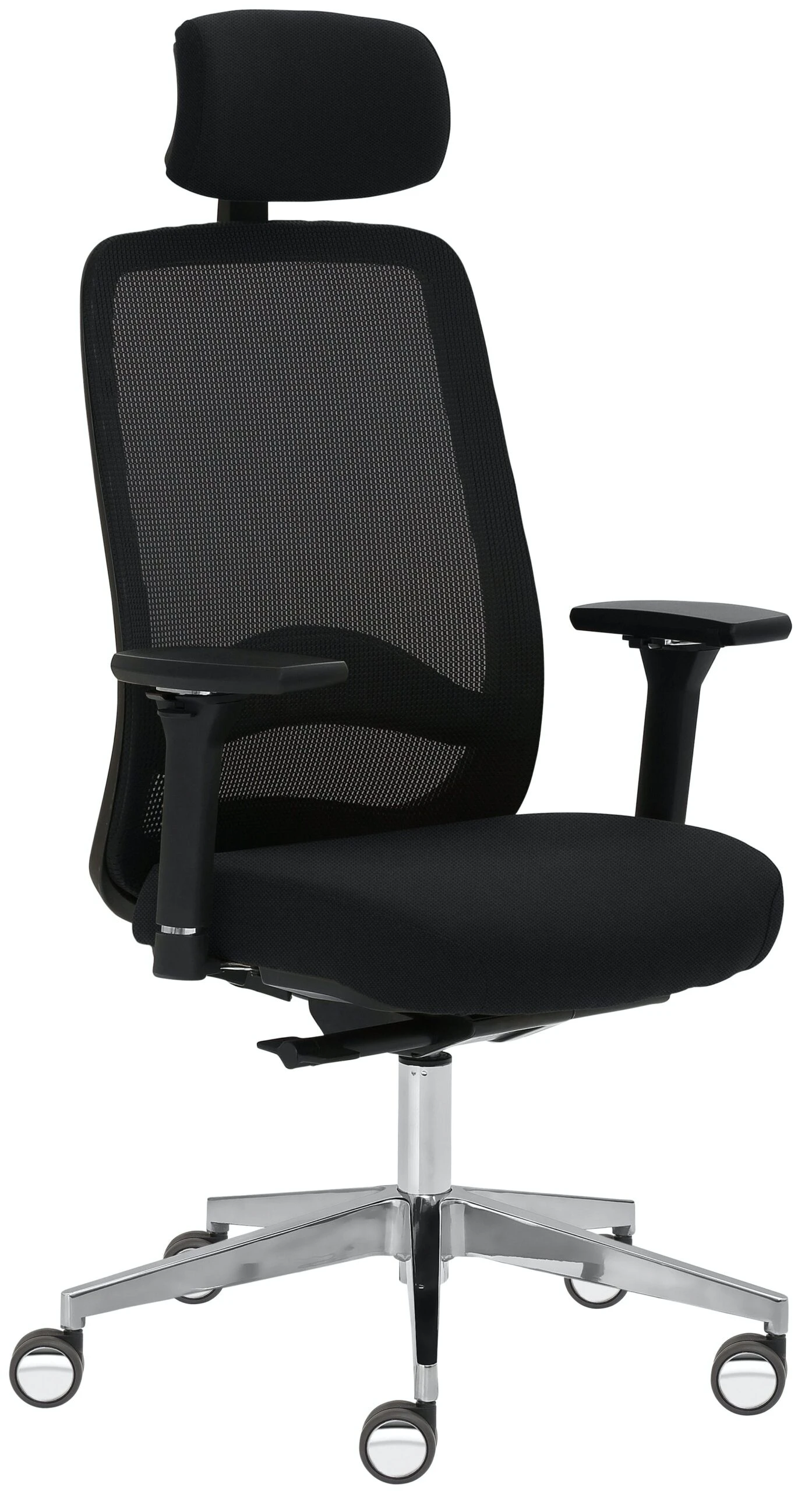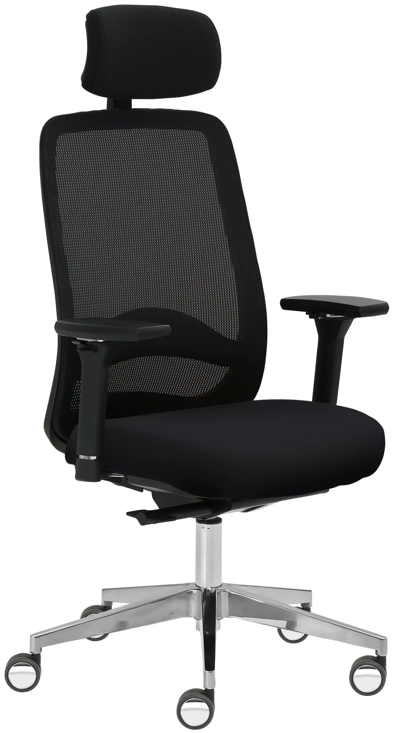 Hoher Netzrücken schwarz, extra stark gepolsterte Sitzfläche für ein Maximum an Komfort, höhenverstellbare Lordosenstütze, stufenlose Höhenverstellung, Stuhl GS-zertifiziert, Typ C nach DIN EN 1335 – 1 (belastbar bis max. 110 kg). Sitzhöhe 48 – 59 cm. 4D-Armlehnen schwarz. Kopfstütze gepolstert (in Vivo 30617 schwarz). Synchronmechanik mit selbstregulierender Gewichtseinstellung und Sitztiefenverstellung. Alu-Fußkreuz und passende Gasfeder. Inkl. Hartbodenrollen groß, mit Chromblende.