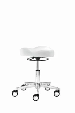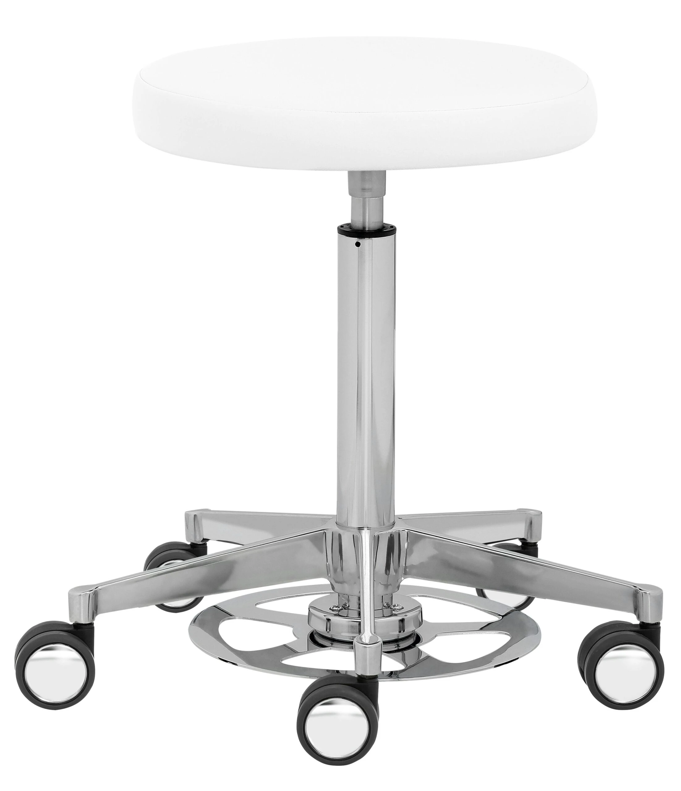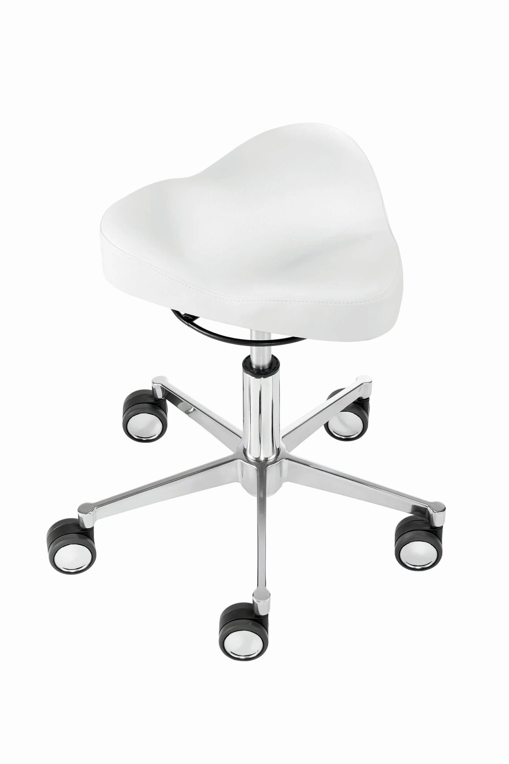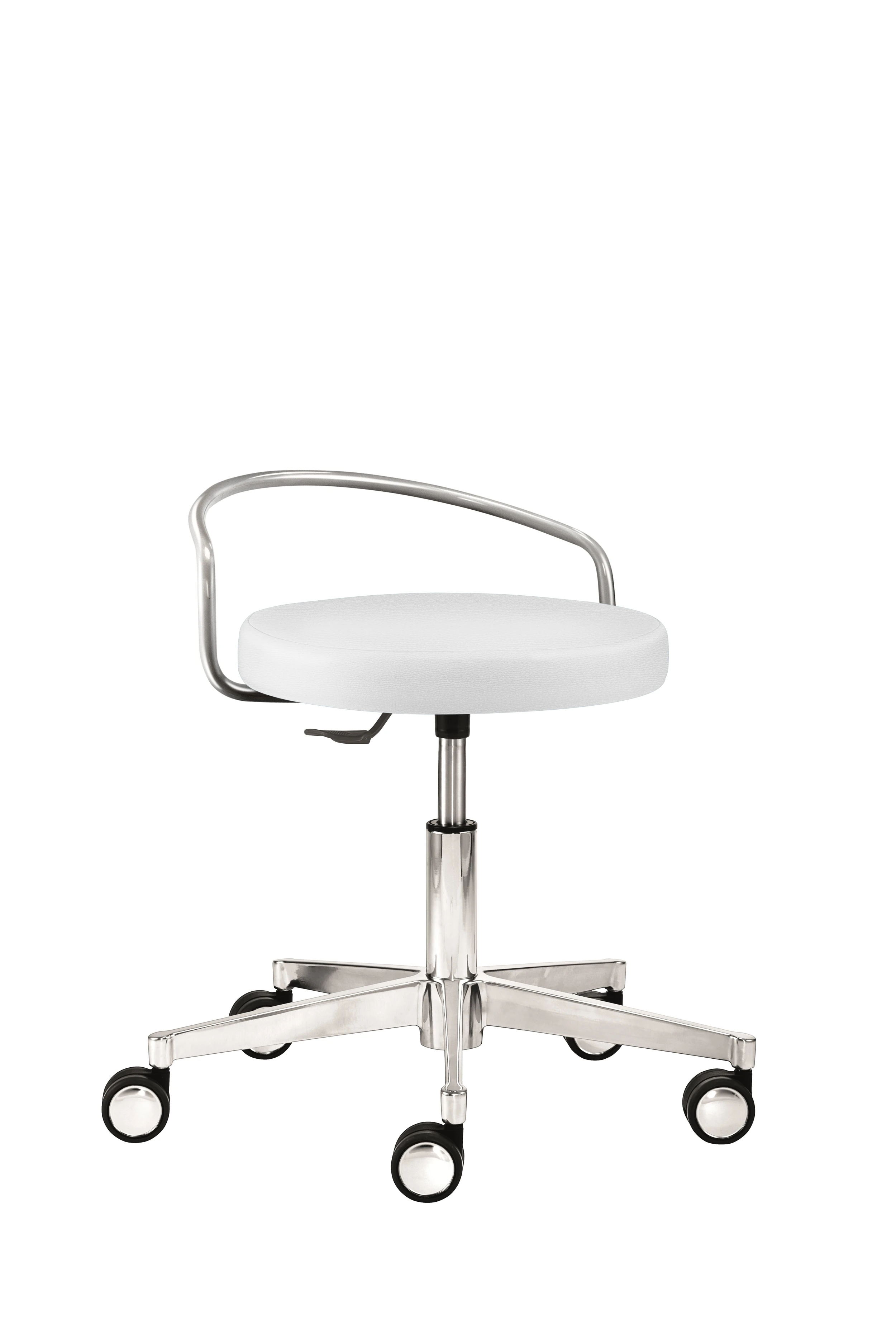 Mit Dreiecksitz, stufenlose Höhenverstellung durch Chrom-Gasfeder, 360° Bewegungsfreiheit, Ringauslöser, Alu-Fußkreuz (Ø 52 cm), inkl. Hartbodenrollen mit Chromblenden, Sitzhöhe 39 – 50 cm.