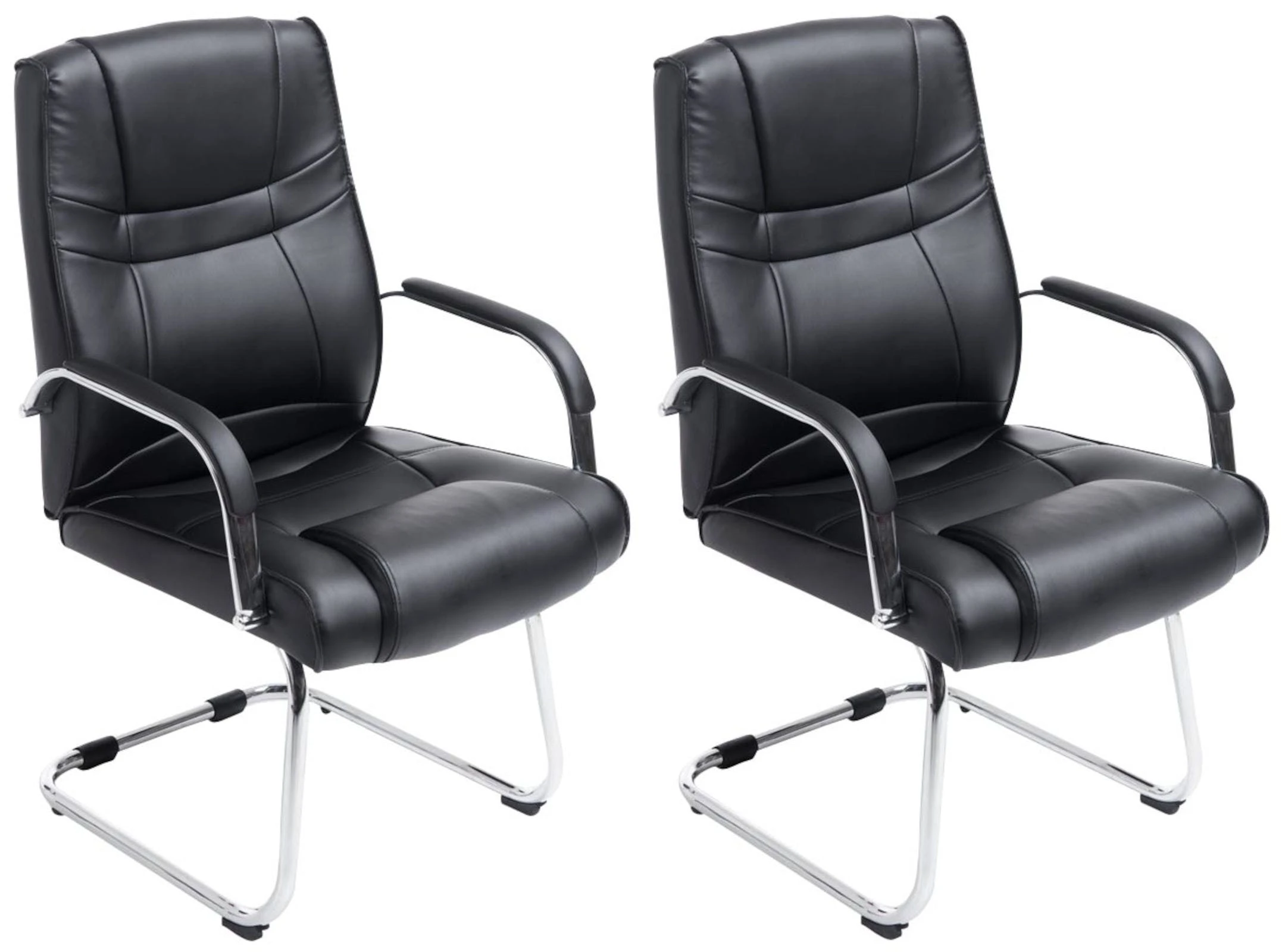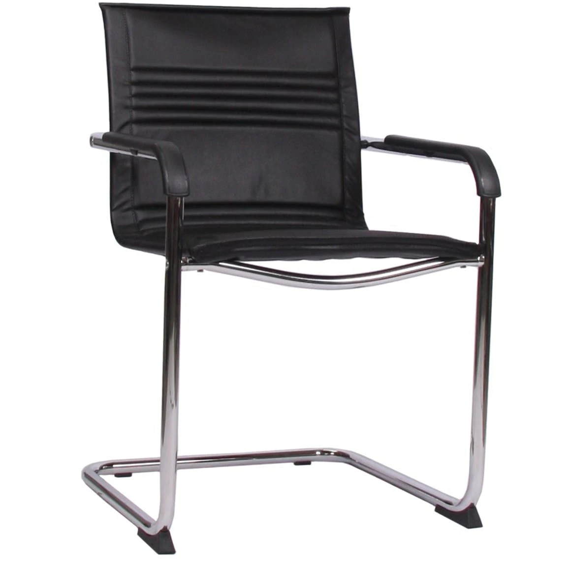 Gestell Chrom, mittlerer Rücken, Vorderseite Echtleder schwarz, Steppnähte, feste Chrom-Armlehnen mit Echtleder-Polsterung, Sitzhöhe 44 cm.