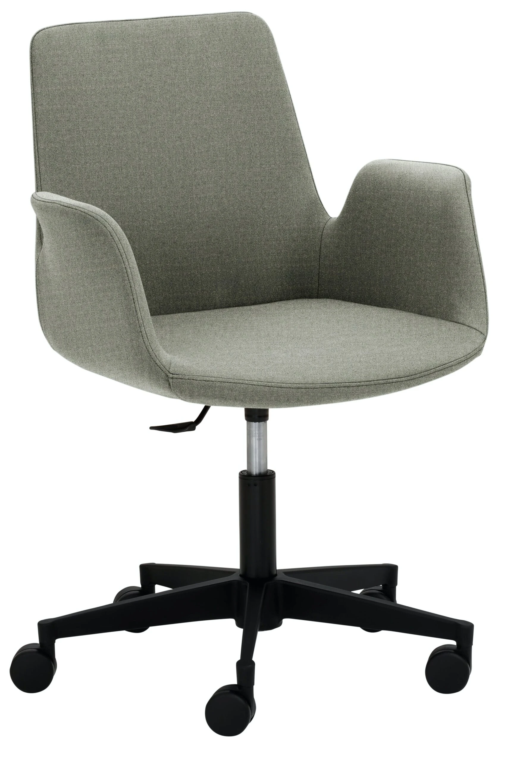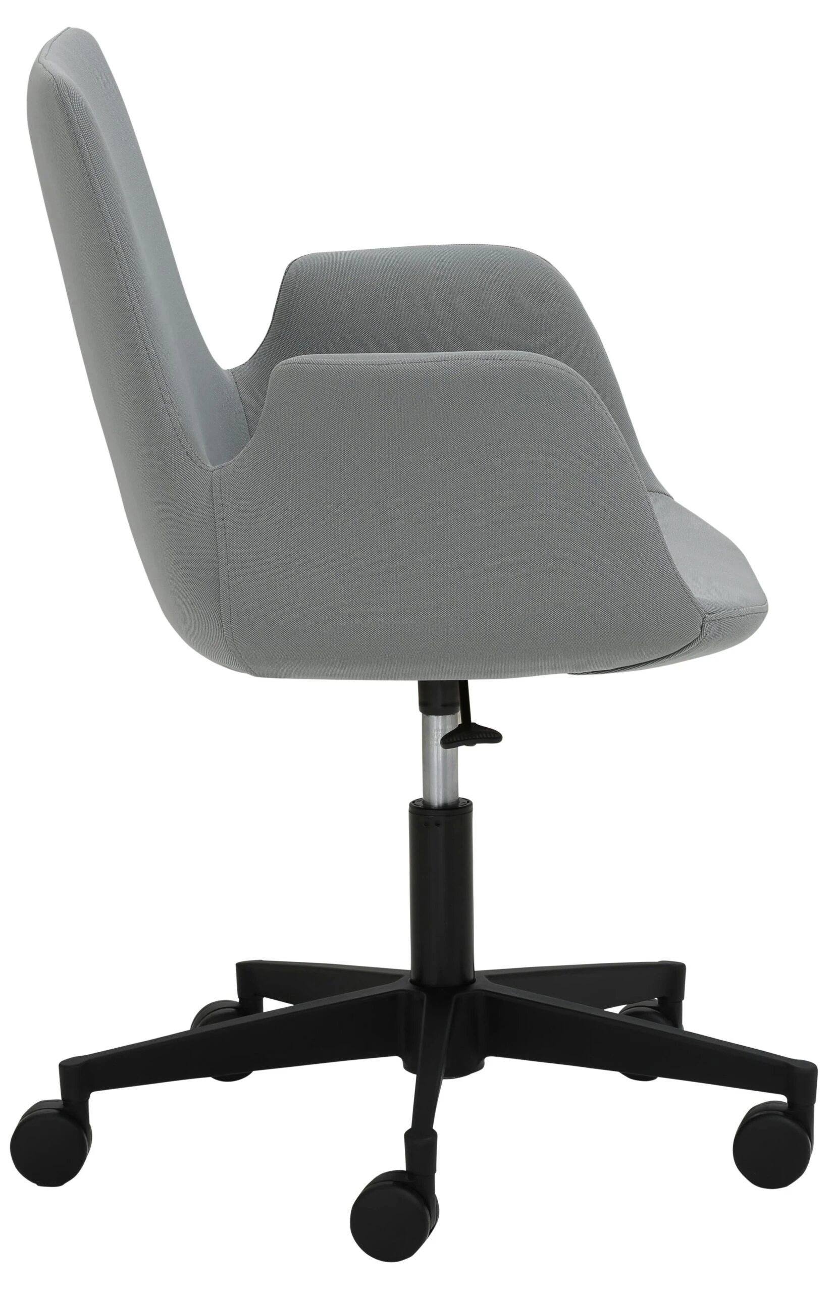 Mit Alu-Fußkreuz (ø 61 cm), mit integrierten Armlehnen, rundum gepolstert, stufenlose Höhenverstellung durch Chrom Gasfeder, Bewegungsfreiheit 360°, Hebelauslöser, inkl. Teppichbodenrollen mit Chromrücken, Sitzhöhe 42 – 53 cm.