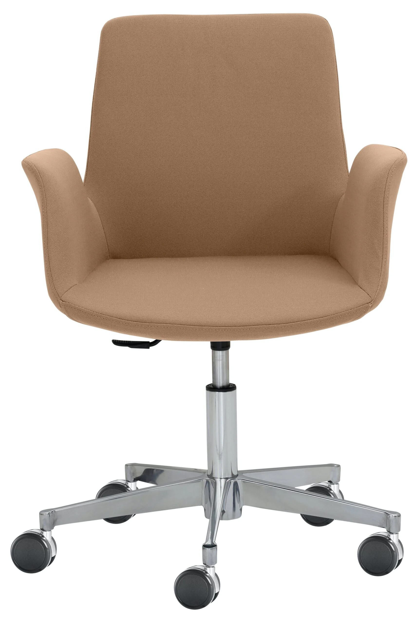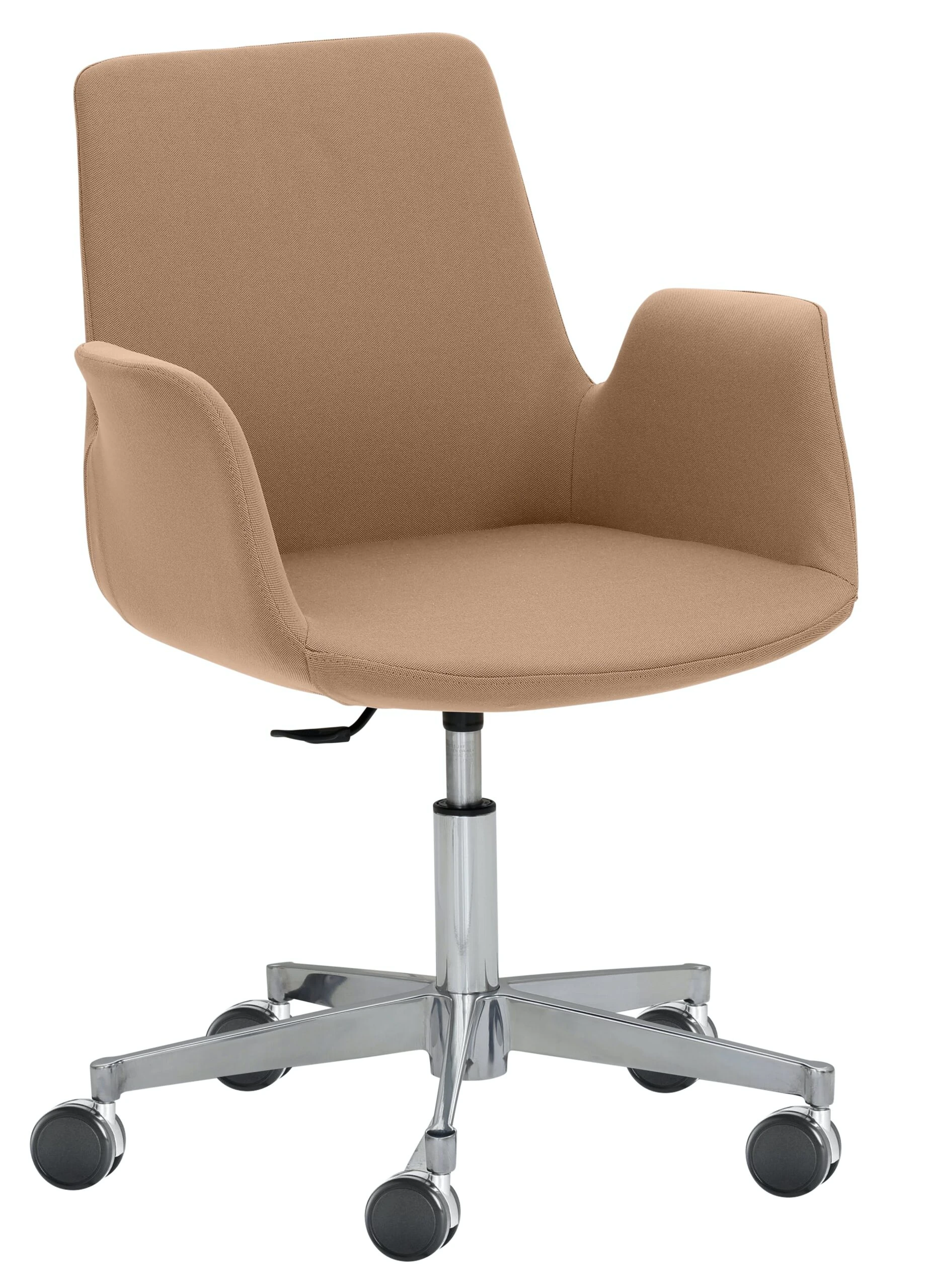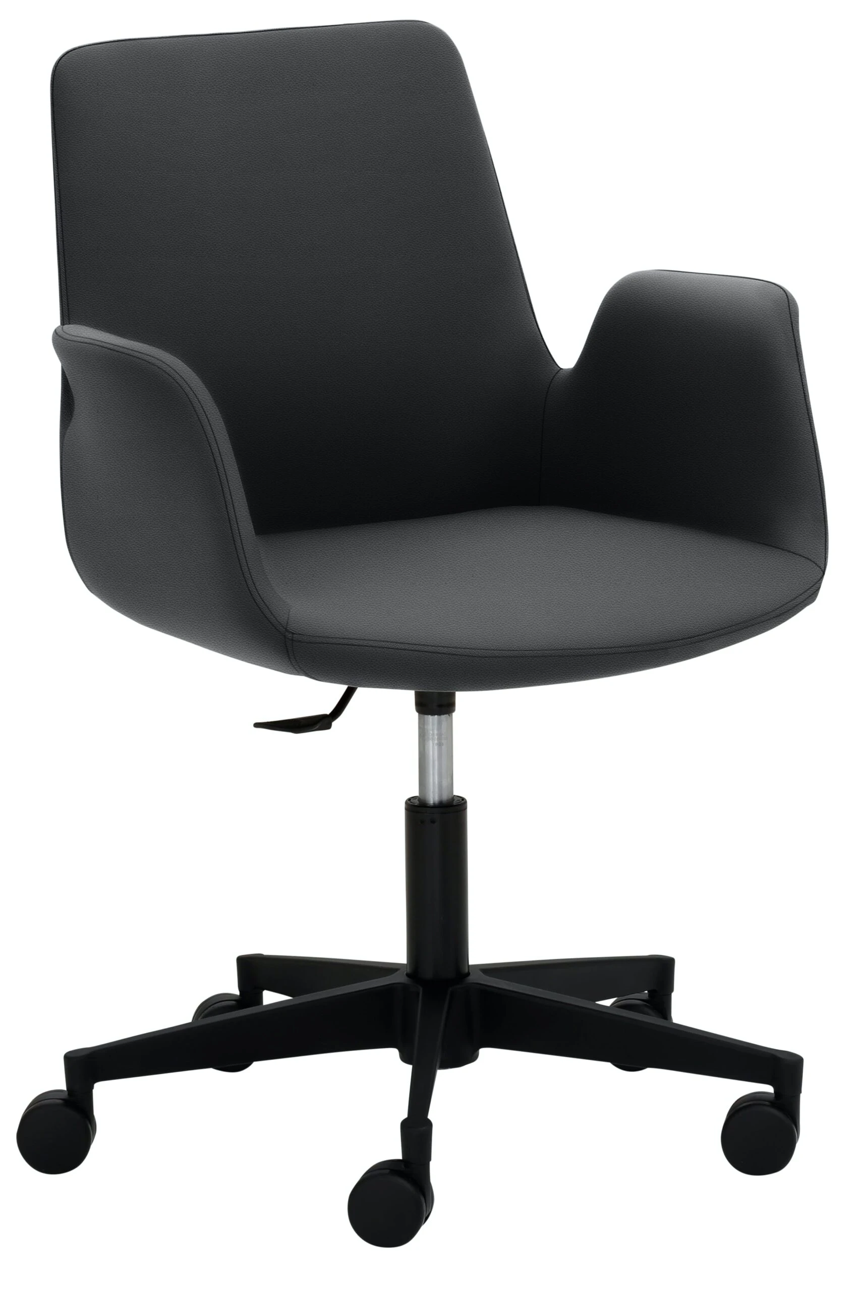 Mit Alu-Fußkreuz (ø 61 cm), mit integrierten Armlehnen, rundum gepolstert, stufenlose Höhenverstellung durch Chrom Gasfeder, Bewegungsfreiheit 360°, Hebelauslöser, inkl. Teppichbodenrollen mit Chromrücken, Sitzhöhe 42 – 53 cm.